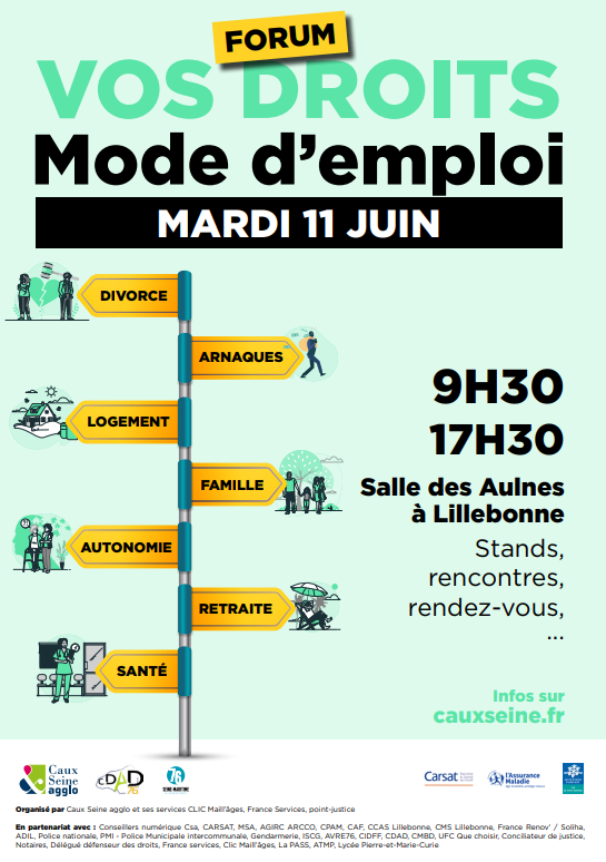 Ne manquez pas le Forum “Vos droits : Mode d’emploi”, organisé par Caux Seine agglo, venez rencontrer une trentaine de partenaires spécialisés dans les domaines de la famille, du travail, du logement, de la retraite et des prestations sociales. Ils seront là pour vous conseiller.
